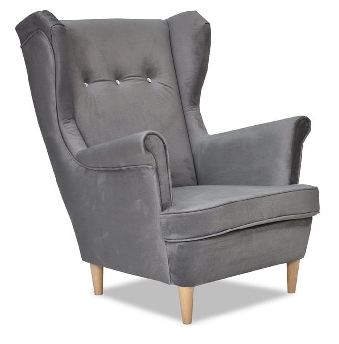 Fotel Uszak Monolith 85 szary z kryształkowymi guzikami – elegancja, komfort i praktyczność.