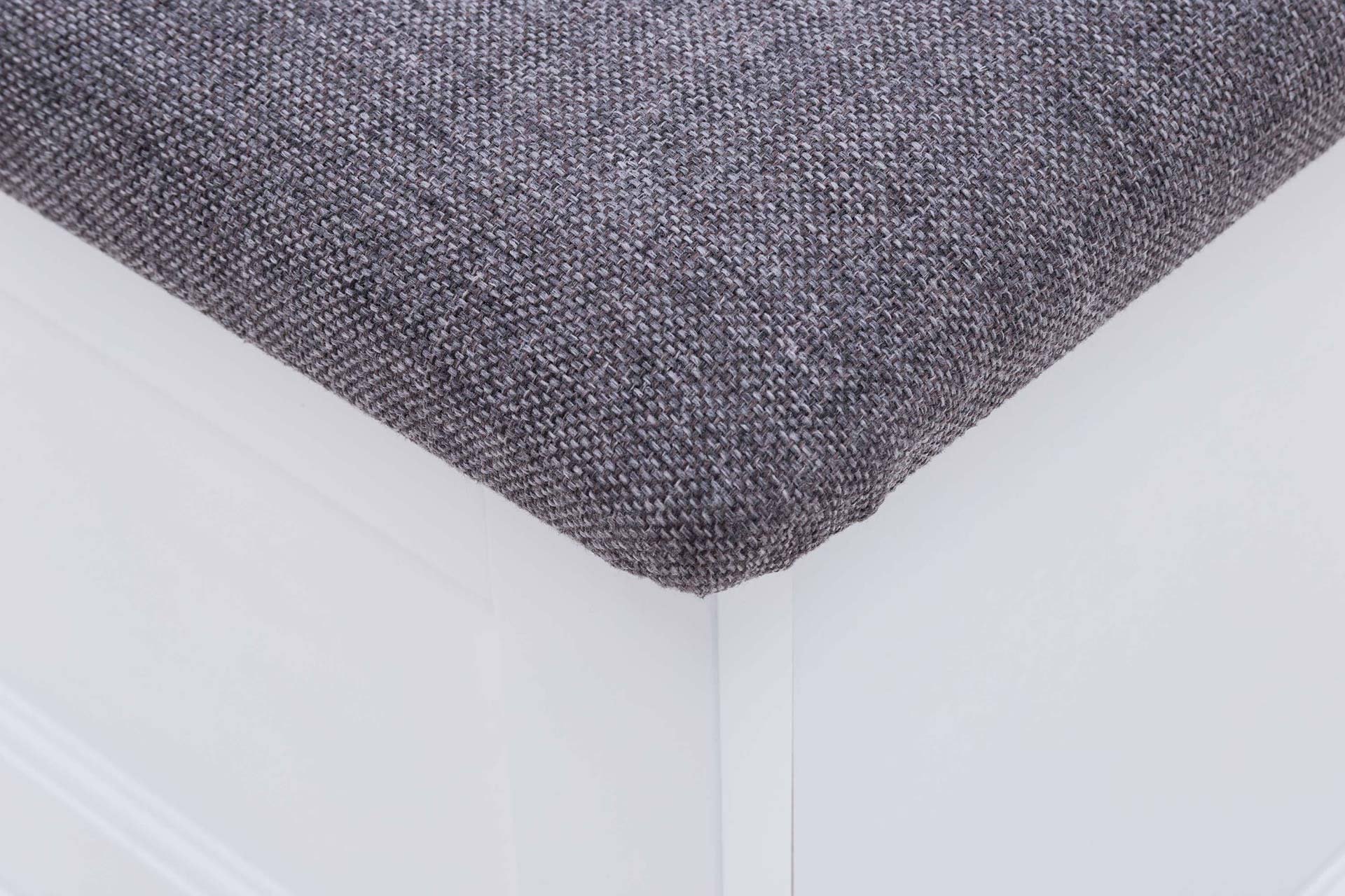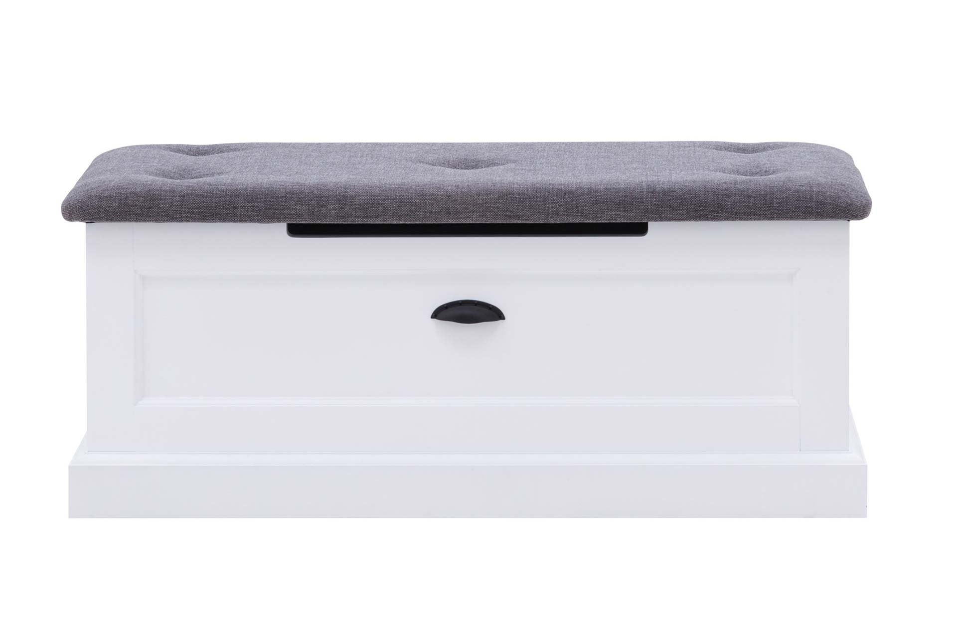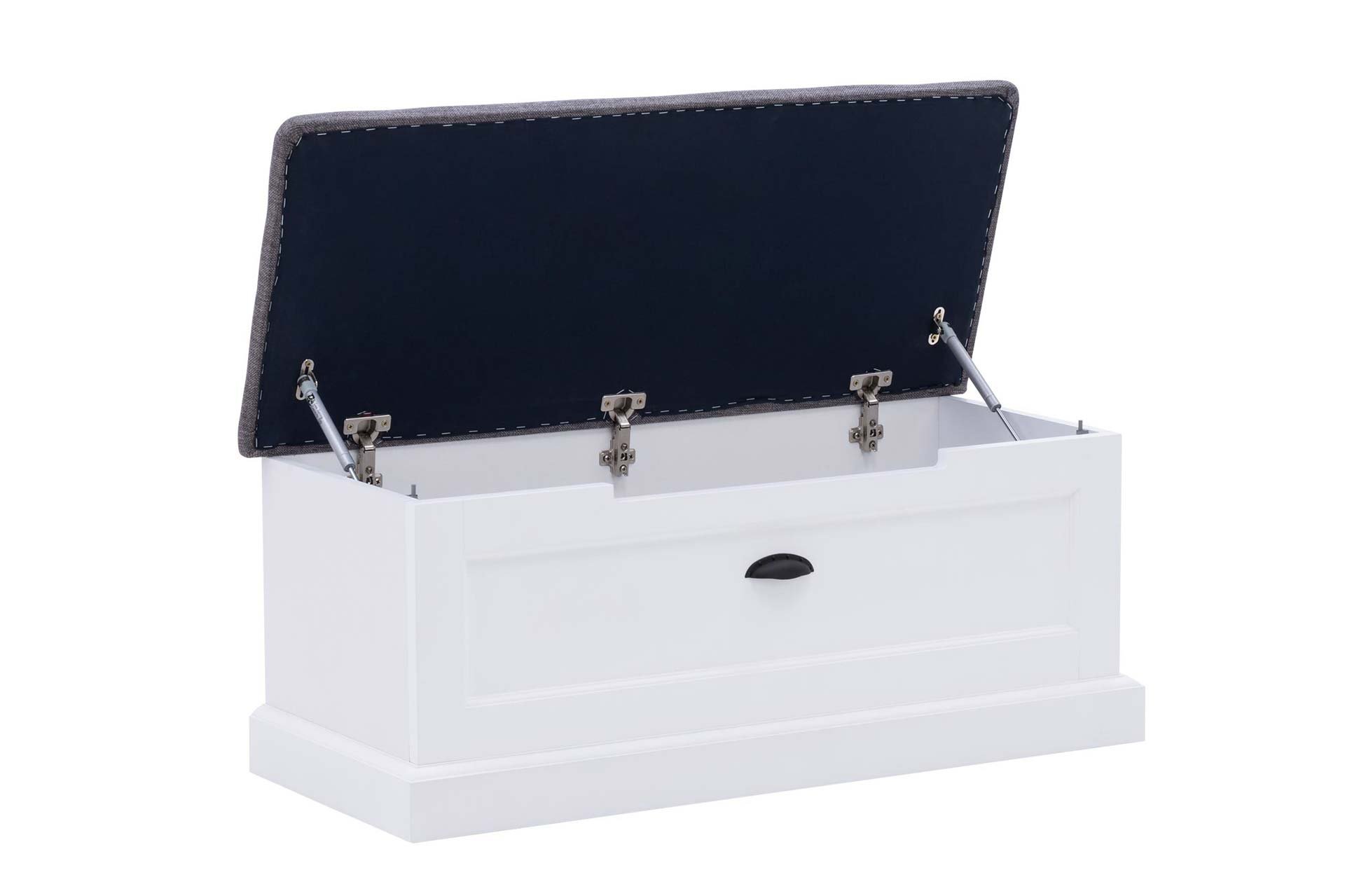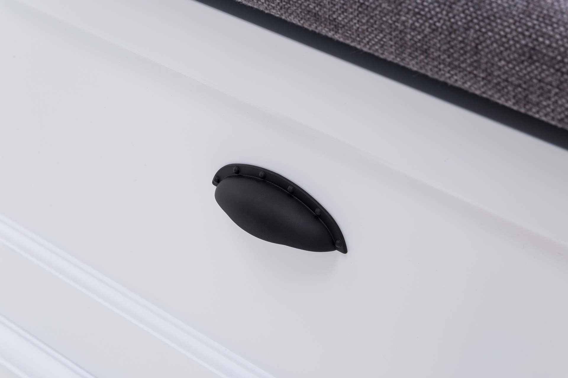 Czysty, biały kolor sprawia, że mebel pasuje do różnych aranżacji – od klasycznych po nowoczesne. Tapicerowane siedzisko dodaje komfortu, a czarne metalowe uchwyty przełamują jasną kolorystykę i podkreślają styl prowansalski.