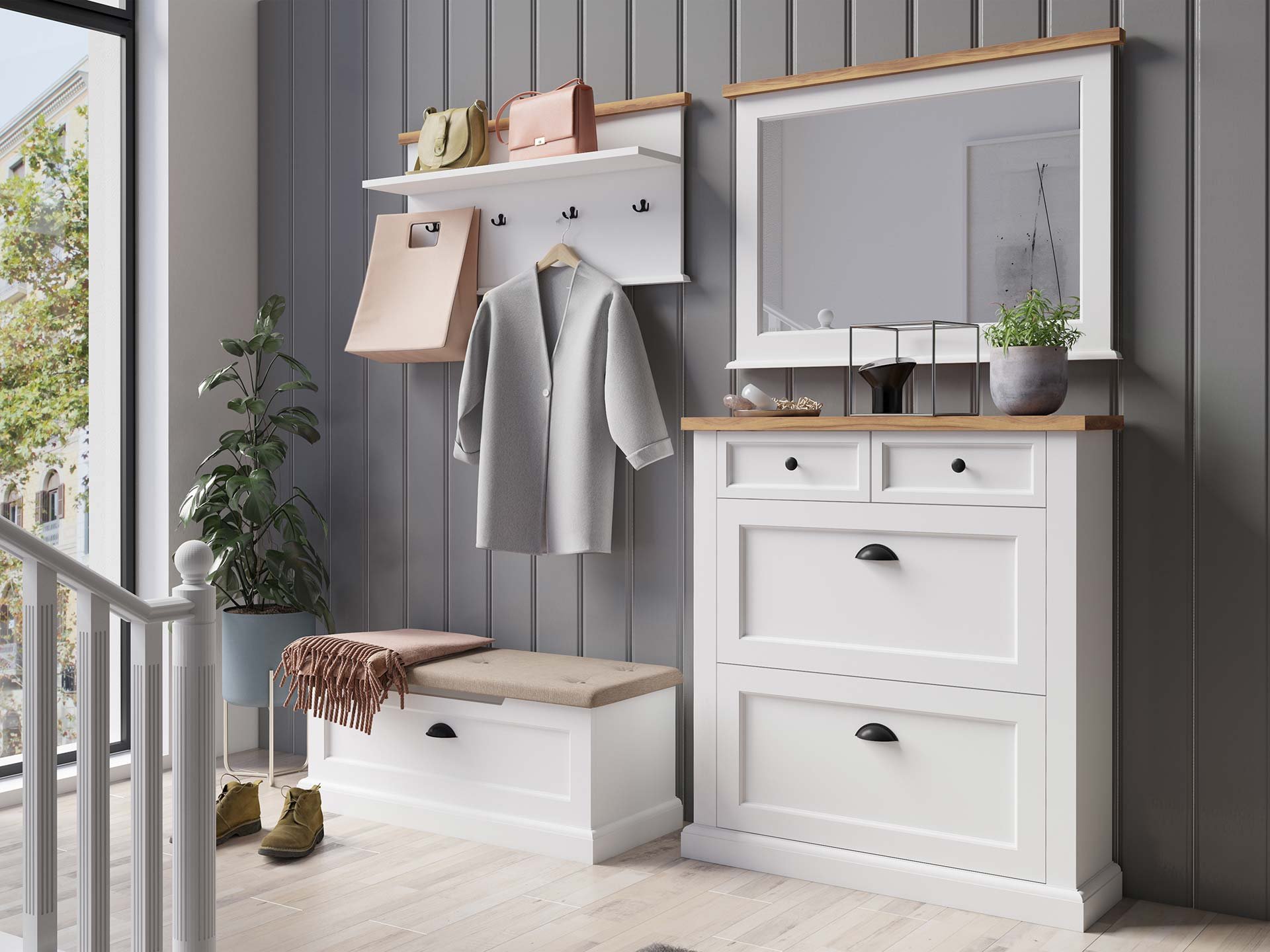 Zestaw do przedpokoju Galia to eleganckie i funkcjonalne rozwiązanie do przechowywania ubrań oraz butów, który łączy w sobie ponadczasowe piękno bieli oraz drewna z funkcjonalnością.
