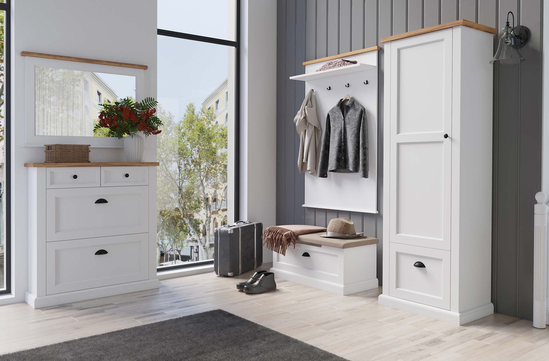 Zestaw do przedpokoju Galia to eleganckie i funkcjonalne rozwiązanie do przechowywania ubrań oraz butów, który łączy w sobie ponadczasowe piękno bieli oraz drewna z funkcjonalnością.