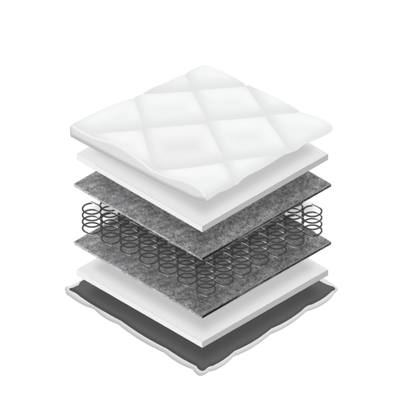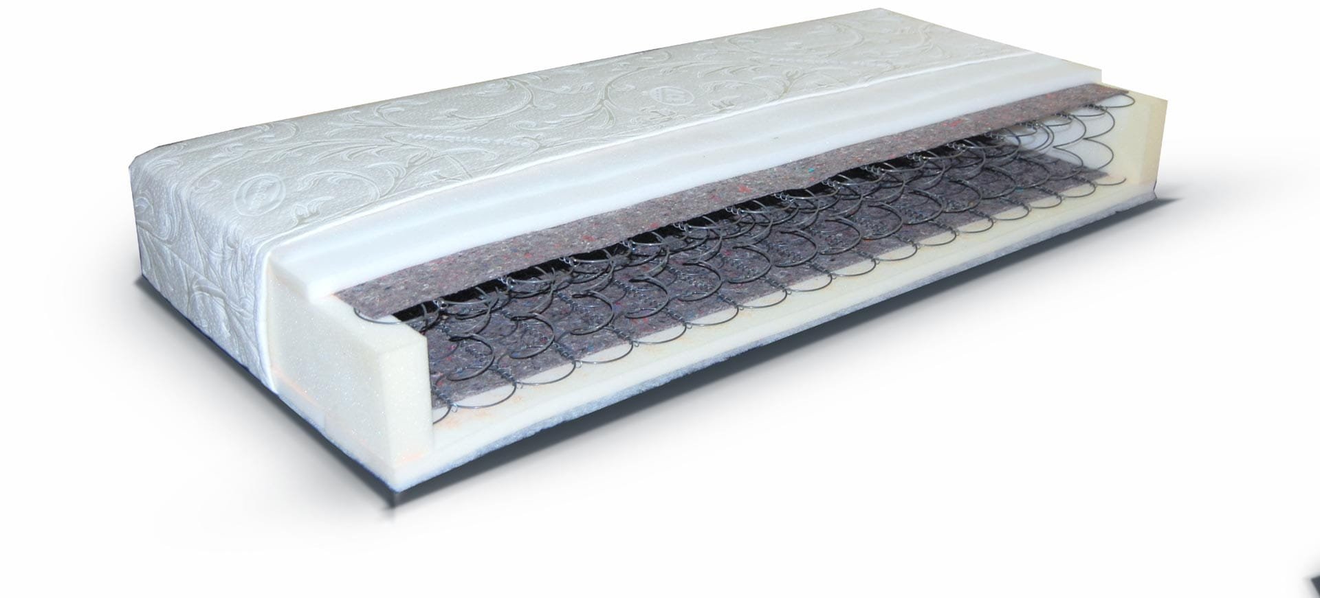 Z obu stron zastosowano warstwę pianki poliuretanowej T-25 o grubości 2 cm, która zapewnia dobre dopasowanie do ciała i wspiera kręgosłup podczas snu. Dodatkowo pianka została obłożona owatą o gramaturze 100 g/m², co poprawia cyrkulację powietrza i zwiększa komfort użytkowania. Sprężyny w części górnej i dolnej zostały zabezpieczone warstwą filcu oraz pianką T-25, co gwarantuje stabilność i równomierne rozłożenie ciężaru ciała.
