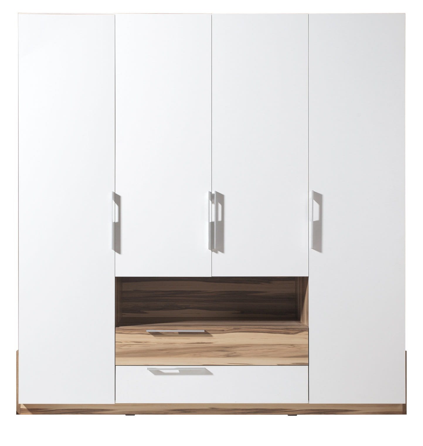 Pojemna szafa 4 drzwiowa po środku 4 półki z płyty, po bokach drążek nad drążkiem półka z płyty u dołu po środku 2 szuflady.