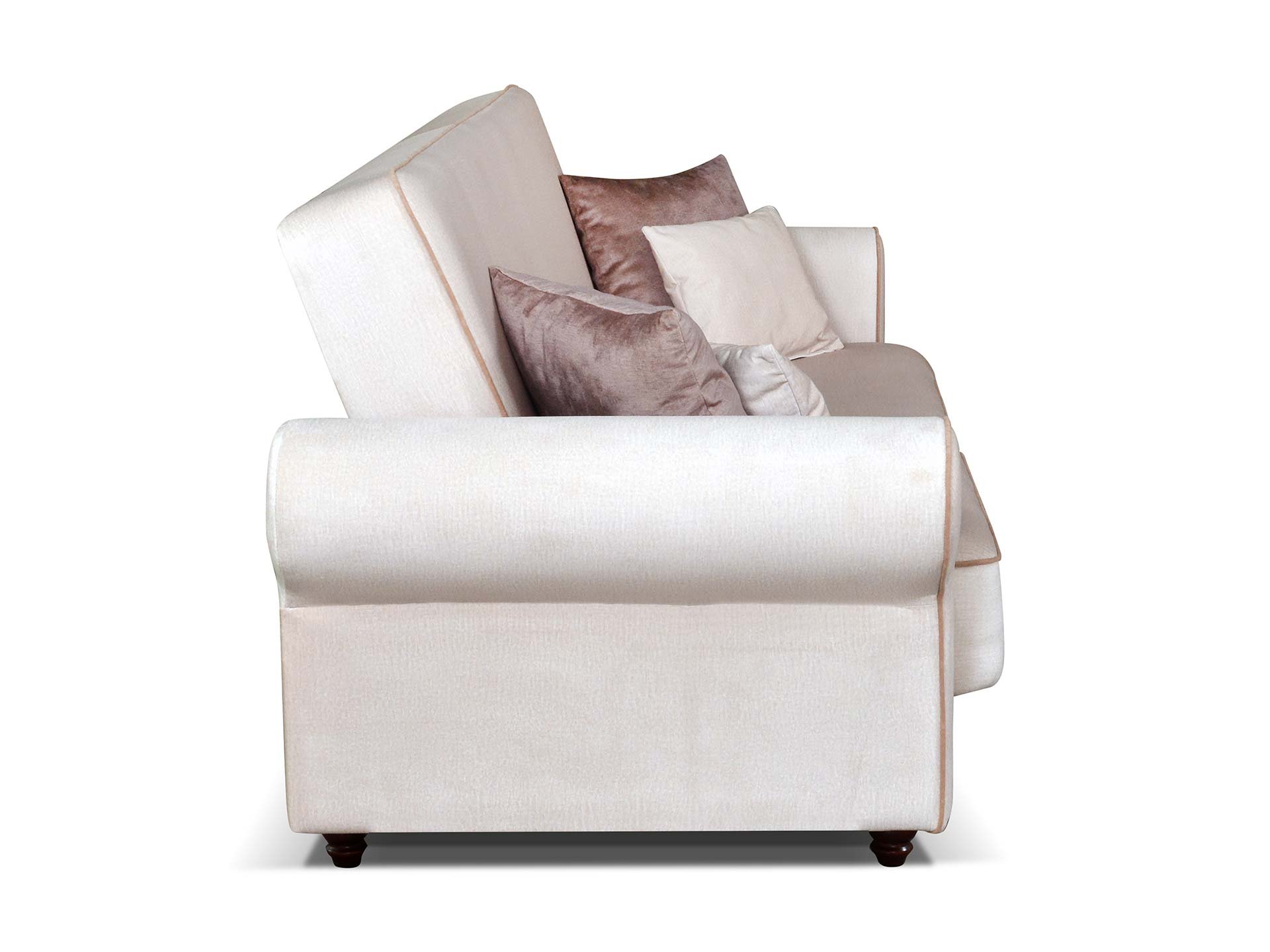 Wersalka na zdjęciu dostępna w kolorze KRONOS 22 poduszki małe, poduszki duże PAROS 01, lamówka SUEDINE 71 nogi BUK.