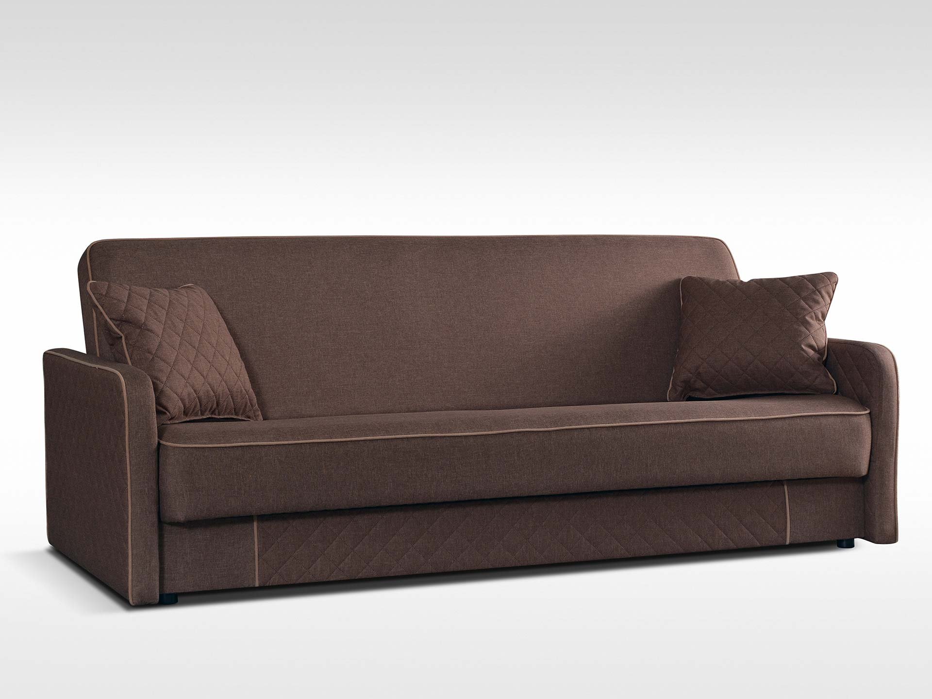 Elegancka, nowoczesna, rozkładana wersalka z eleganckimi lamówkami oraz pikowaniem na skrzyni.